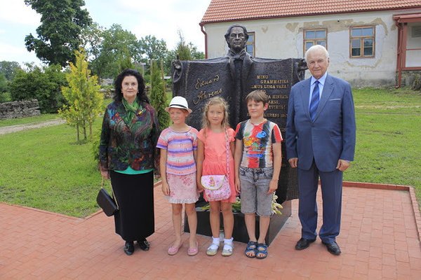 | Tallinna Toomkooli õpilased koos presidendipaariga Eduard Ahrensi ausamba ees |