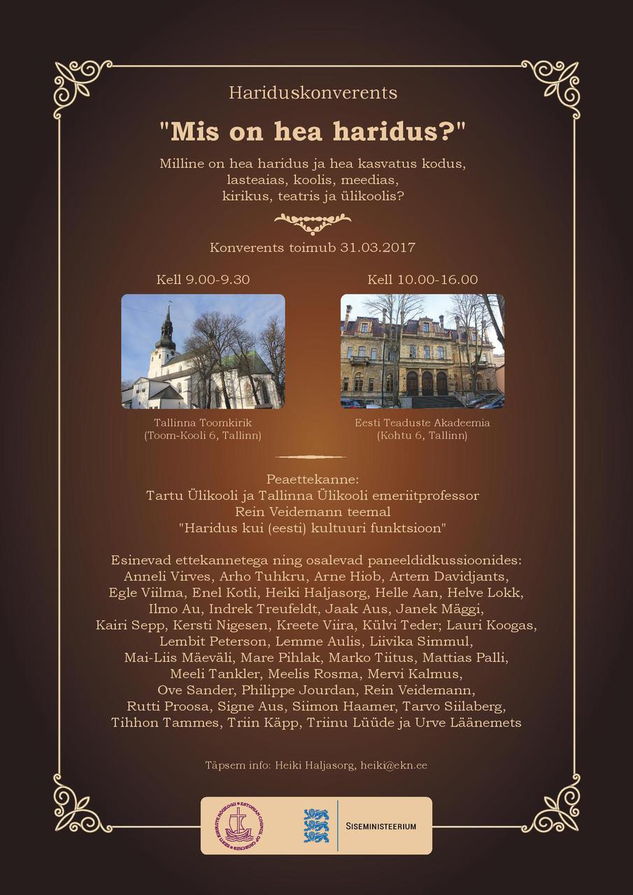 31.märtsil 2017 toimus Eesti Kirikute Nõukogu hariduskonverents koostöös Siseministeeriumiga pealkirjaga: "Milline on hea haridus?" ja mille alapealkiri oli "Milline on hea haridus ja hea kasvatus kodus, lasteaias, koolis, meedias, kirikus, teatris ja ülikoolis?" Konverents toimus kell 9.00-9.30 Toomkirikus ning kell 10.00-16.00 Eesti Teaduste Akadeemias.